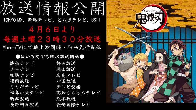 Kimetsu no Yaiba TV Anime will be broadcast from April 6 every Saturday at 23:30 JST, TOKYO MX, Gunma TV, Tochigi TV, BS11!